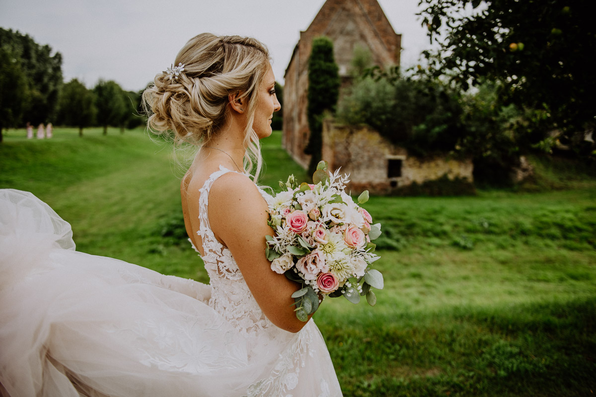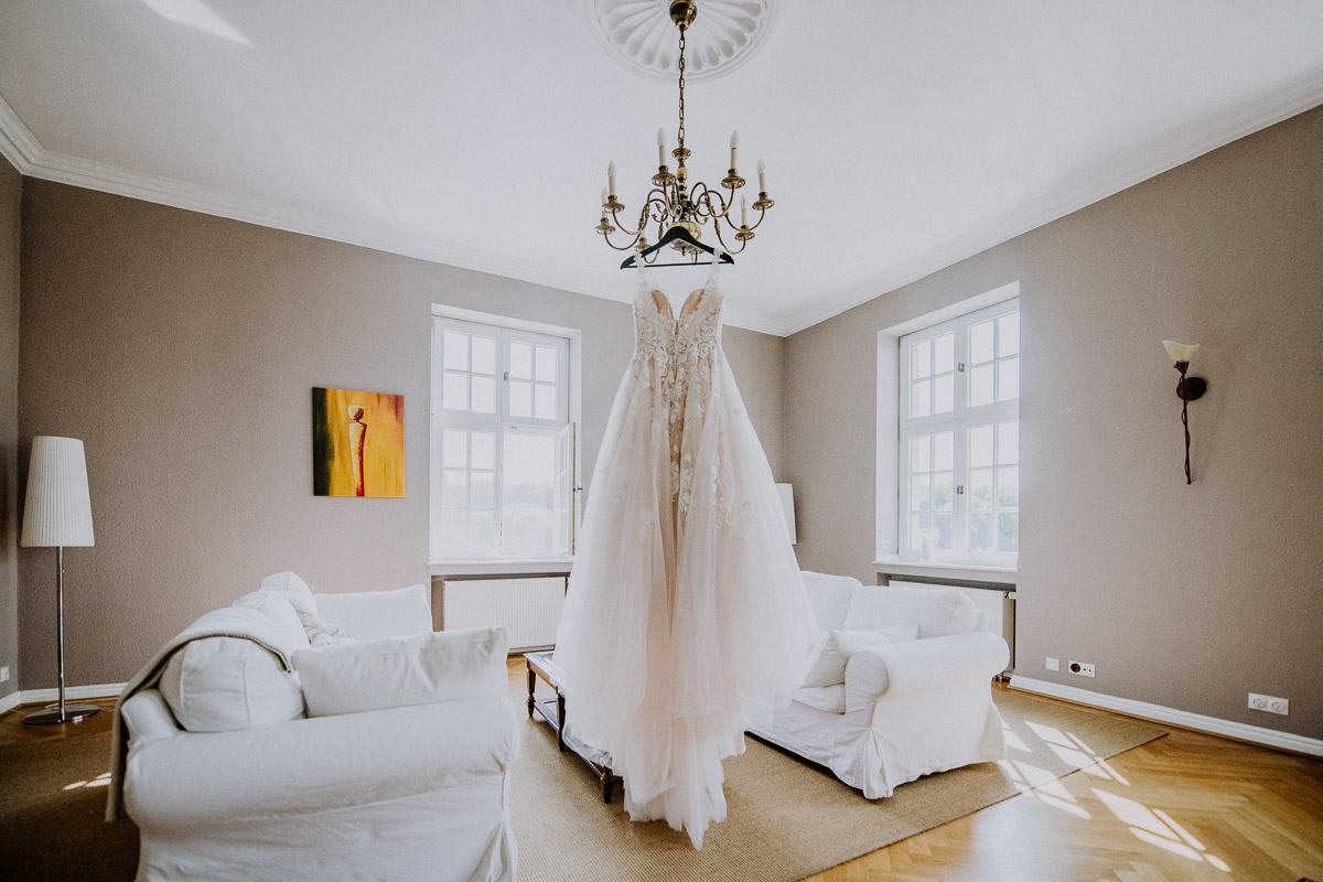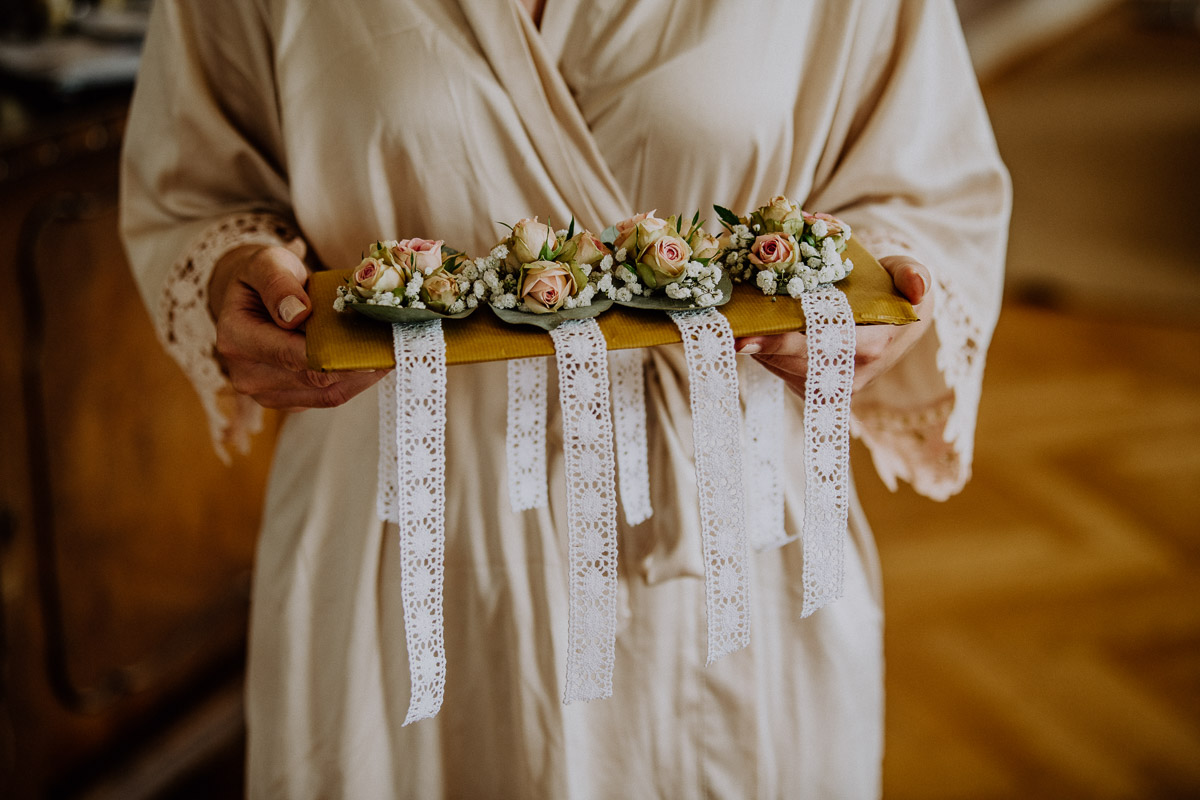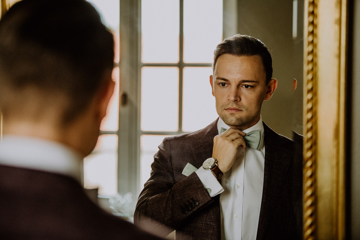 Das Schloss liegt idyllisch inmitten von alten Bäumen, einem verwunschenen Park und einem charmanten Innenhof. Schon am Morgen lag eine besondere Stimmung in der Luft. Sowohl Lisa als auch Jaro haben sich direkt im Schloss für ihren großen Tag vorbereitet – das Getting Ready war für beide voller Vorfreude, Lachen und kleiner, berührender Augenblicke. Ich liebe es, solche stillen, echten Momente fotografisch festzuhalten: der Duft von frischen Blumen, das leise Rascheln des Brautkleids, der Blick in den Spiegel kurz bevor alles beginnt.