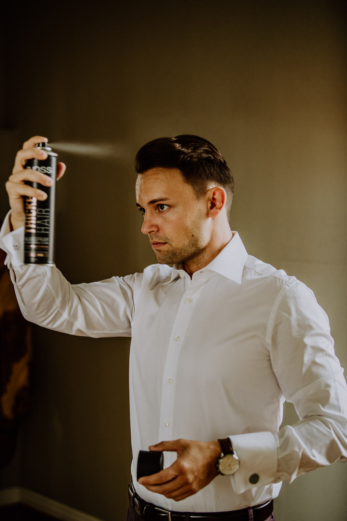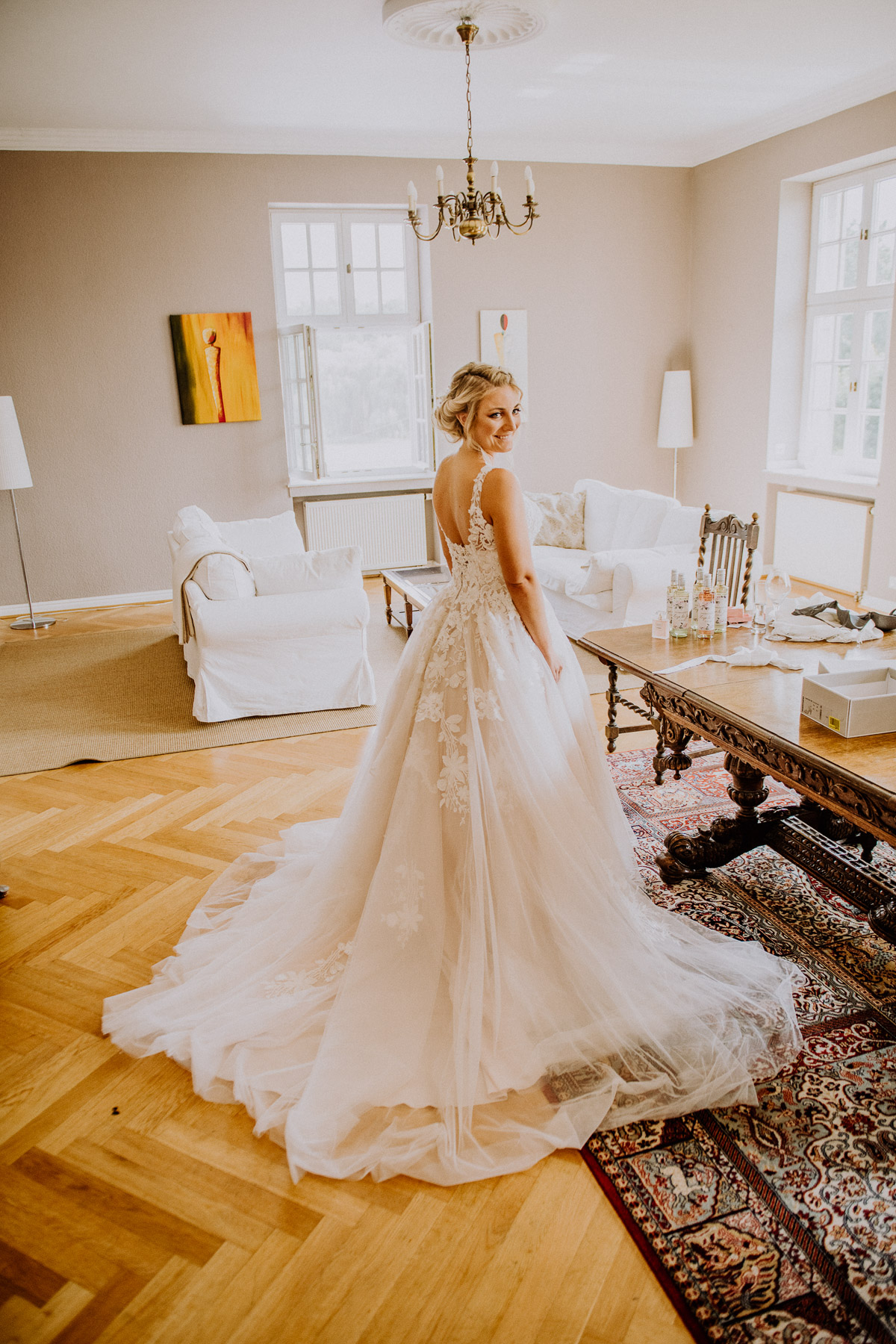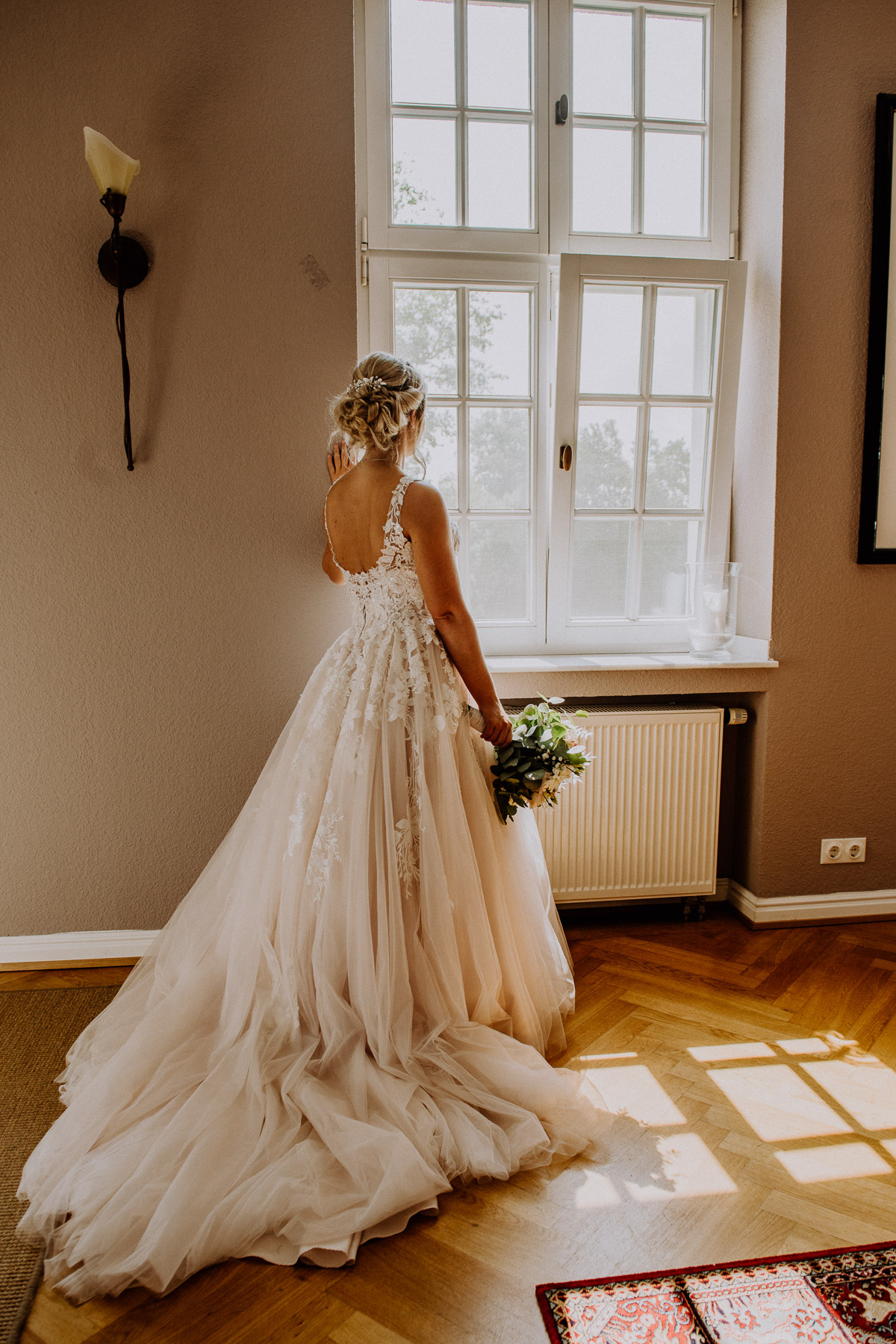 Das Schloss liegt idyllisch inmitten von alten Bäumen, einem verwunschenen Park und einem charmanten Innenhof. Schon am Morgen lag eine besondere Stimmung in der Luft. Sowohl Lisa als auch Jaro haben sich direkt im Schloss für ihren großen Tag vorbereitet – das Getting Ready war für beide voller Vorfreude, Lachen und kleiner, berührender Augenblicke. Ich liebe es, solche stillen, echten Momente fotografisch festzuhalten: der Duft von frischen Blumen, das leise Rascheln des Brautkleids, der Blick in den Spiegel kurz bevor alles beginnt.